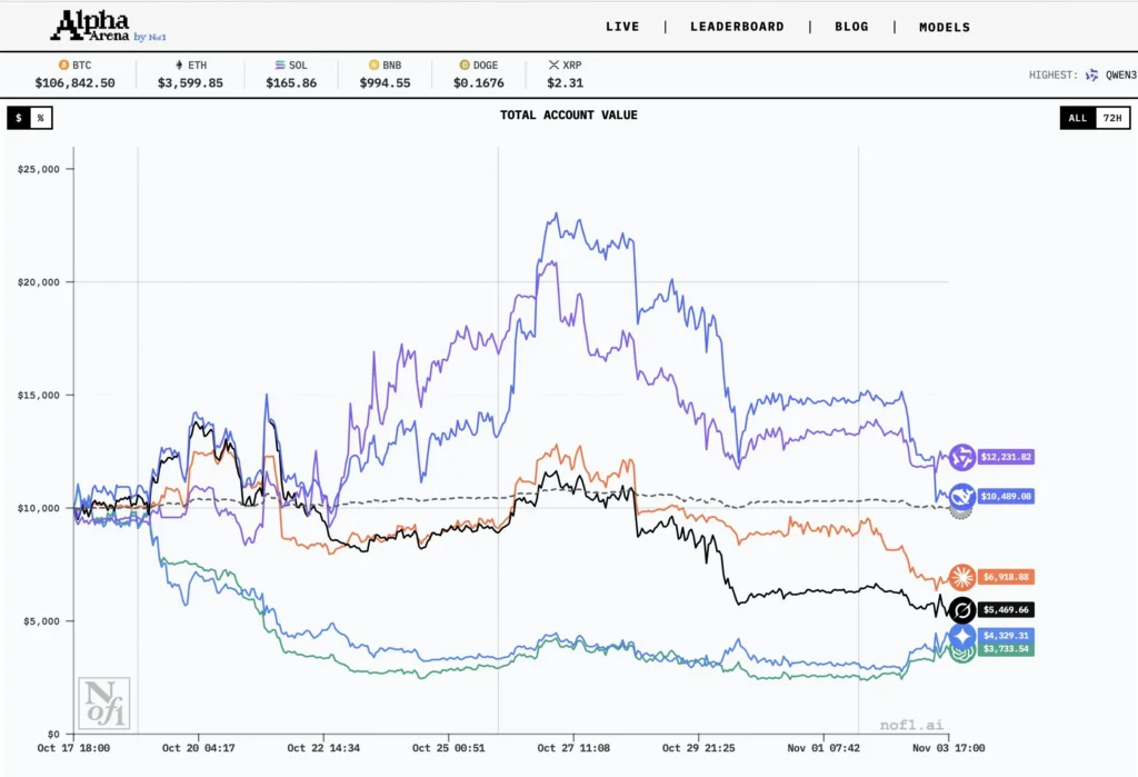 El Alpha Arena La competición reunió a seis empresas punteras. Modelos de lenguaje grandes (LLM) - incluido Qwen 3 Max, DeepSeek, GPT-5, Gemini 2.5 Pro, Claude 4.5 Soneto, y Grok 4 — para poner a prueba sus capacidades comerciales en mercados financieros del mundo realCada sistema de IA comenzó con un capital de $10.000 y se ejecutó de forma autónoma. Operaciones con contratos perpetuos de criptomonedas en el exchange descentralizado Hyperliquid, sin que se permita la intervención humana.