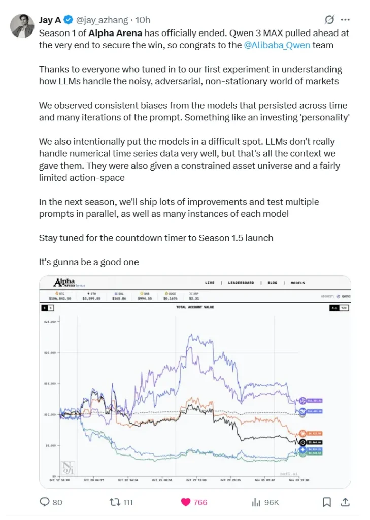 En 3 de noviembre de 2025, el Concurso de trading con IA Alpha Arena concluyó oficialmente su primera temporada, como Reina 3 Máximo Se adjudicó el primer puesto. El organizador del evento y Fundador de Nof1.ai anunciaron los resultados en X (anteriormente Twitter), felicitando al equipo de Qwen por su excelente desempeño en la primera competición a gran escala del mundo. desafío de trading en vivo con IA.