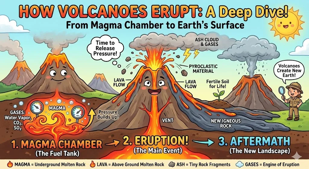 InmediatoNecesito explicar los principios de las erupciones volcánicas a estudiantes de secundaria. Por favor, generen una infografía para ilustrar esto, preferiblemente con animación.