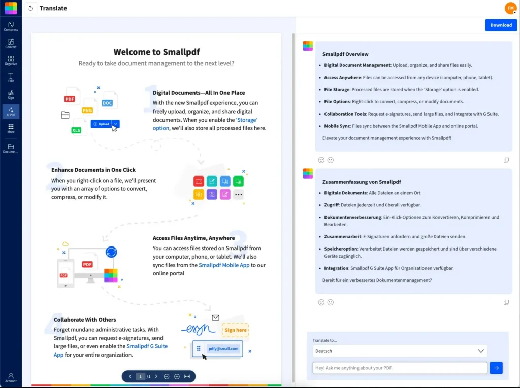 | Herramientas clave | Generador de preguntas y respuestas en PDF, resumidor de PDF con IA, generador de información sobre PDF | Convertir, comprimir, firmar |