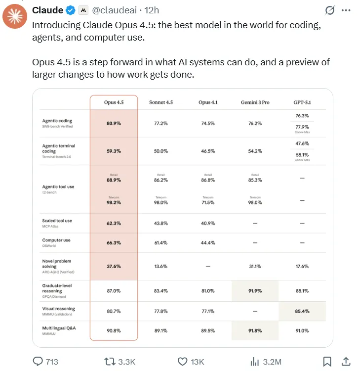 En el intenso sprint de dos semanas entre los principales proveedores de Modelos de Lenguaje Grande (LLM), Anthropic ha subido la apuesta. Tras los lanzamientos de Gemini 3 Pro de Google y ChatGPT-5.1 de OpenAIAnthropic presentó oficialmente su modelo insignia, Claude Opus 4.5, el 24 de noviembre. El cuenta oficial de Claude En X (Twitter) inmediatamente lo proclamó “el mejor modelo del mundo para codificación, agentes y uso de computadoras”, lo que señala un cambio importante.