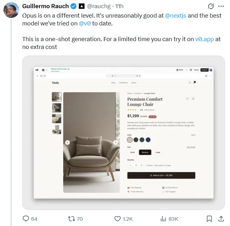 Opus 4.5 brilla en escenarios de programación del mundo real. Guillermo Rauch, director ejecutivo de la plataforma front-end Vercel, utilizó el nuevo modelo para crear un sitio web de comercio electrónico completo y afirmó que el resultado de una sola vez fue "impresionante" y que "Opus está en un nivel diferente".