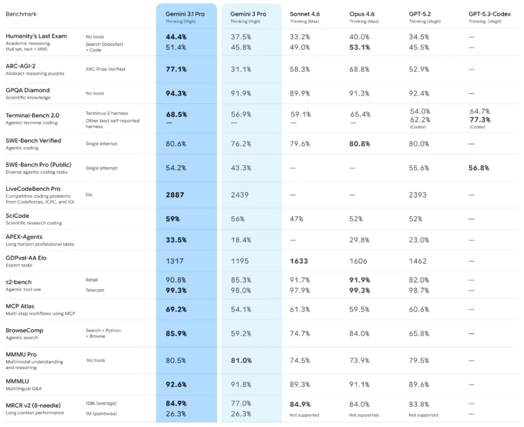De acuerdo a datos oficiales de referencia, Géminis 3.1 Pro registró una veintena de 77.1%, lo que representa un aumento del doble en el rendimiento en comparación con Gemini 3 Pro. Esto indica un avance sustancial en la precisión deductiva al enfrentarse a tareas lógicas desconocidas. Además, las capacidades de razonamiento de Gemini 3.1 Pro muestran una mejora casi... Mejora del 20% sobre el recientemente publicado Soneto de Claude 4.6.