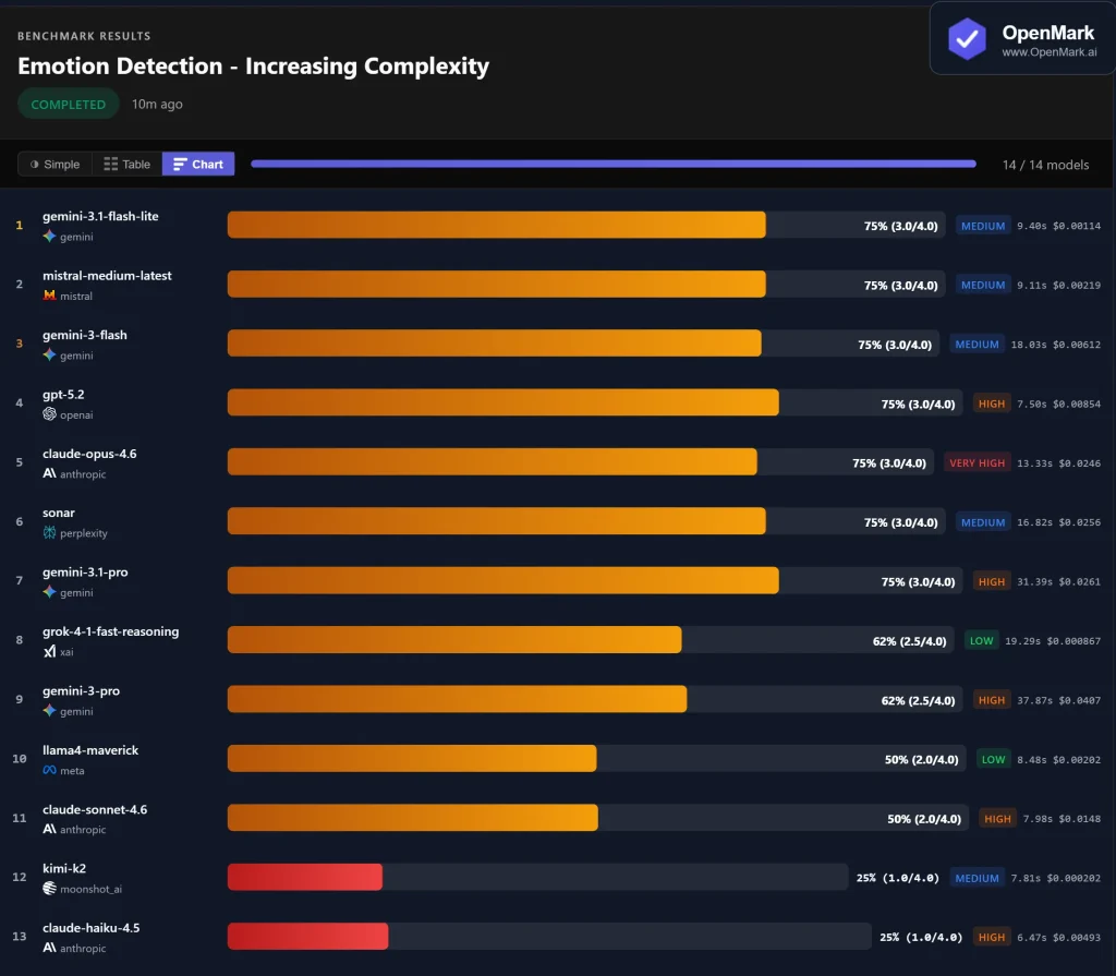 En aplicaciones prácticas, varios usuarios ya han implementado el modelo a gran escala. En una prueba de referencia visual para la detección de emociones humanas, involucrando 14 modelos grandesGemini 3 Flash obtuvo el primer puesto tras una evaluación exhaustiva de precisión, velocidad de respuesta y consumo de tokens. Este resultado confirma su estabilidad al gestionar entradas multimodales complejas.