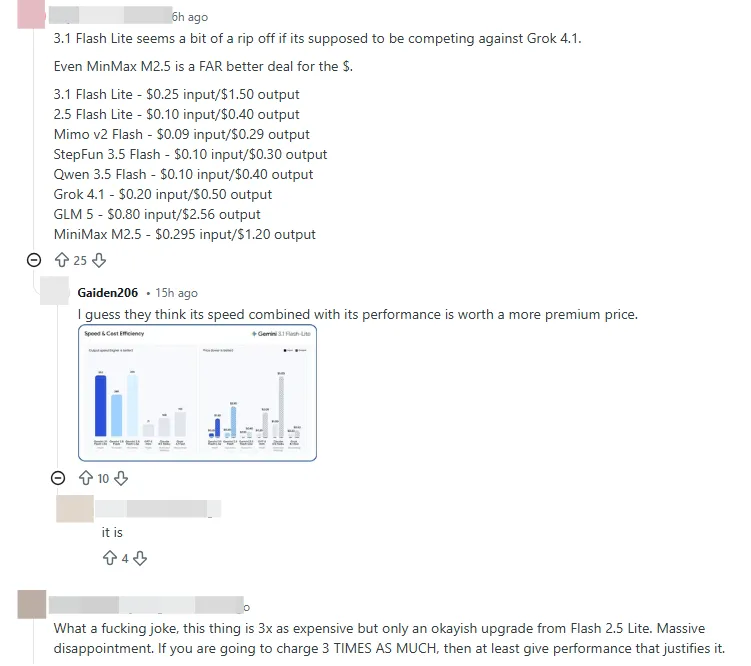 Las métricas muestran que, si bien Gemini 3.1 Flash-Lite tiene un precio más alto que 2.5 Flash, su velocidad de salida ha aumentado aproximadamente 45% y el tiempo hasta el primer token (TTFT) se ha reducido a 40% de la línea base anterior.