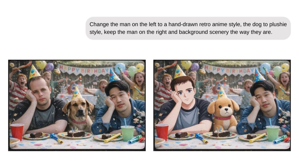 - Composición: Combine personas u objetos de diferentes imágenes de origen en una única escena coherente.