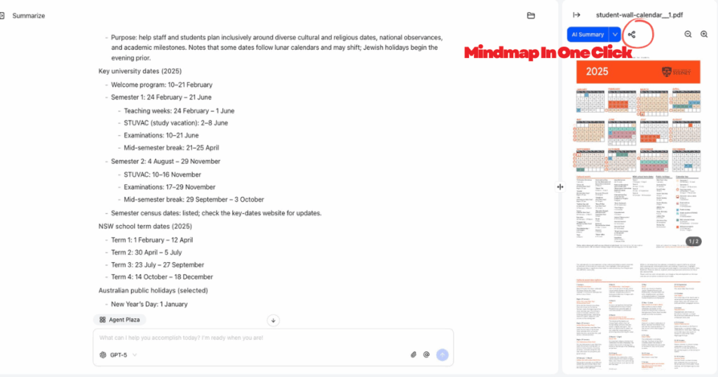 Paso 3: Según el resumen generado, si prefiere un resultado más estructurado, haga clic en el Mapa mental Botón en la parte superior izquierda del panel izquierdo. iWeaver permite convertir con un solo clic un mapa mental, que puedes exportar, modificar o ampliar según tus necesidades. Para obtener más información sobre mapas mentales, visita Agente de mapas mentales