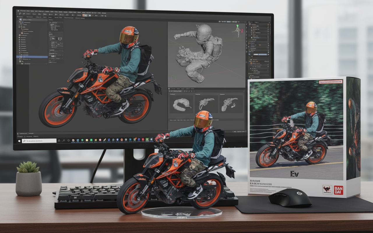 Por ejemplo, la consigna de esta entrada de blog es: Un modelo de figura comercial a escala 1/7 basado en un personaje ilustrado, colocado sobre un escritorio con una base circular de acrílico transparente y sin texto. La pantalla muestra el proceso de modelado de este personaje con ZBrush. Junto a la pantalla se encuentra una caja de embalaje de juguete estilo Bandai con la ilustración original.