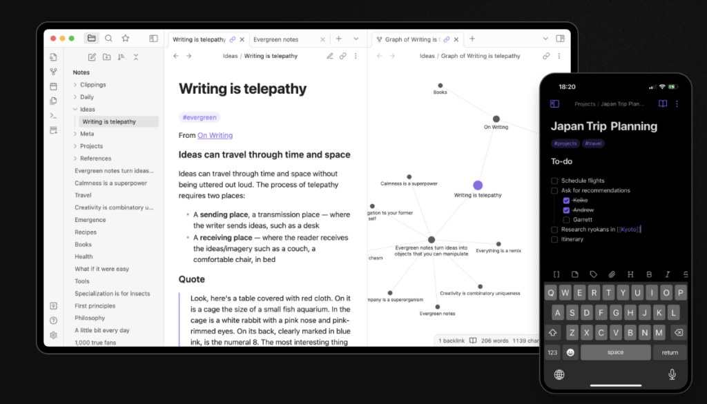 Obsidiana es una herramienta popular de gestión del conocimiento Conocido por su flexibilidad y su enfoque offline, es ideal para usuarios que priorizan la privacidad y el almacenamiento local. Al combinarse con plugins de IA, Obsidian se transforma en una potente base de conocimiento personal con funciones mejoradas. Destaca por su capacidad para vincular notas, permitiendo a los usuarios crear una red de notas interconectadas que imitan la forma en que el cerebro humano organiza la información. Con los plugins de IA, Obsidian puede automatizar tareas como resumir notas, generar insights o incluso sugerir conexiones entre ideas. Su sistema basado en Markdown garantiza que las notas sean ligeras y portátiles, y su funcionalidad offline permite trabajar sin conexión a internet.